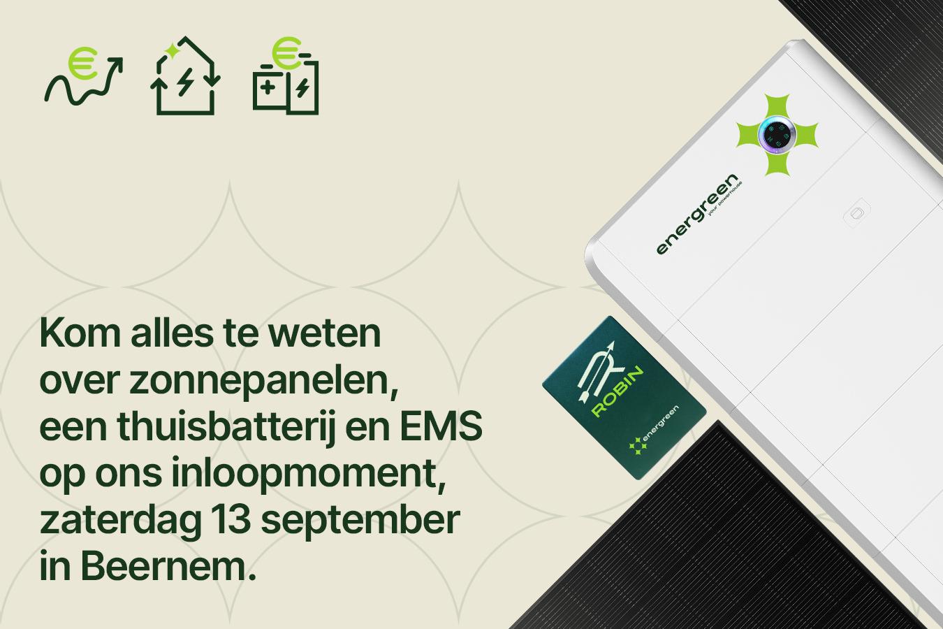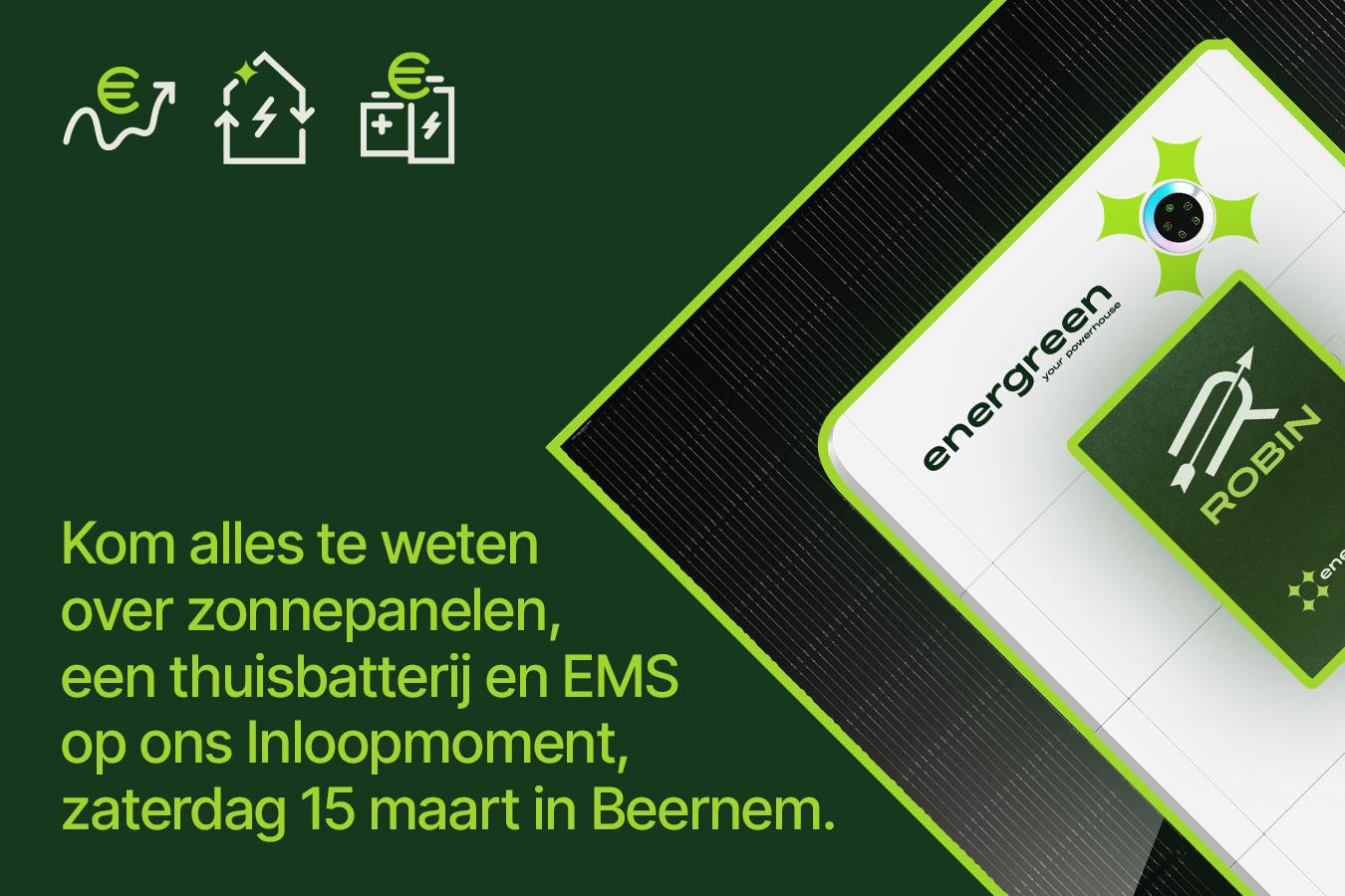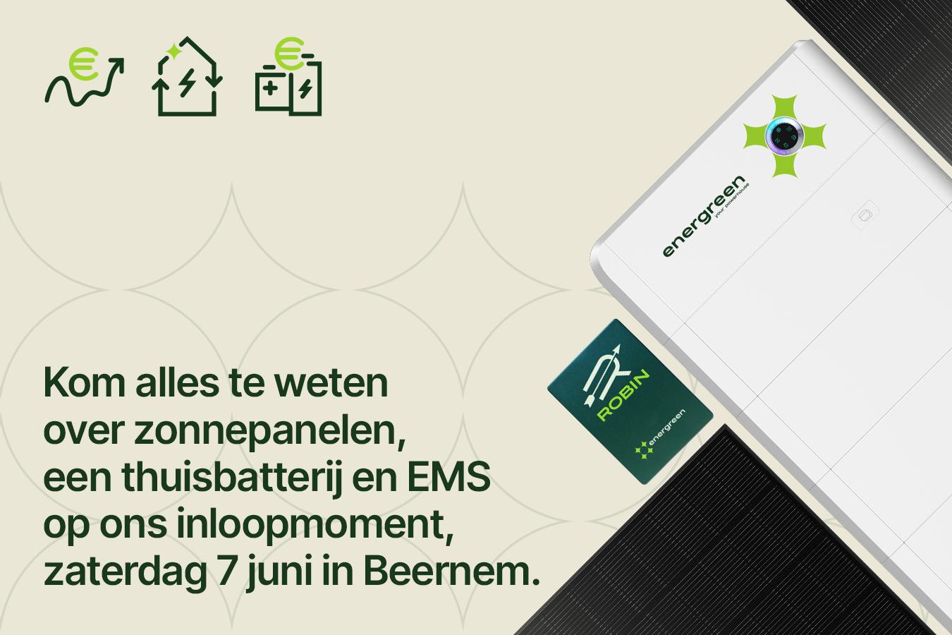 Kom naar onze Inloopavond bij Energreen in Beernem! Ontdek de nieuwste energieoplossingen zoals zonnepanelen, thuisbatterijen en ons slimme energiebeheerplatform ROBIN. Geniet van een rondleiding, een hapje en drankje, en leer over de toekomst van energieverbruik.